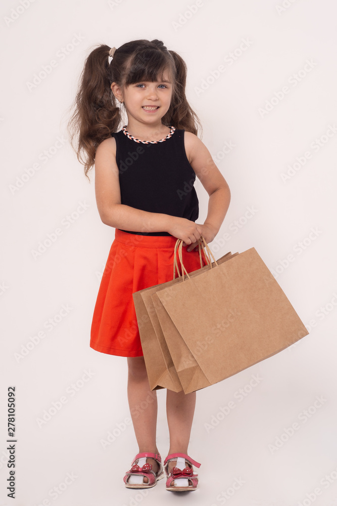 Children With Purchases Isolated On White Background Kid With Shopping Bags Child In Dress Goes To Shop To Buy Stock Photo Adobe Stock